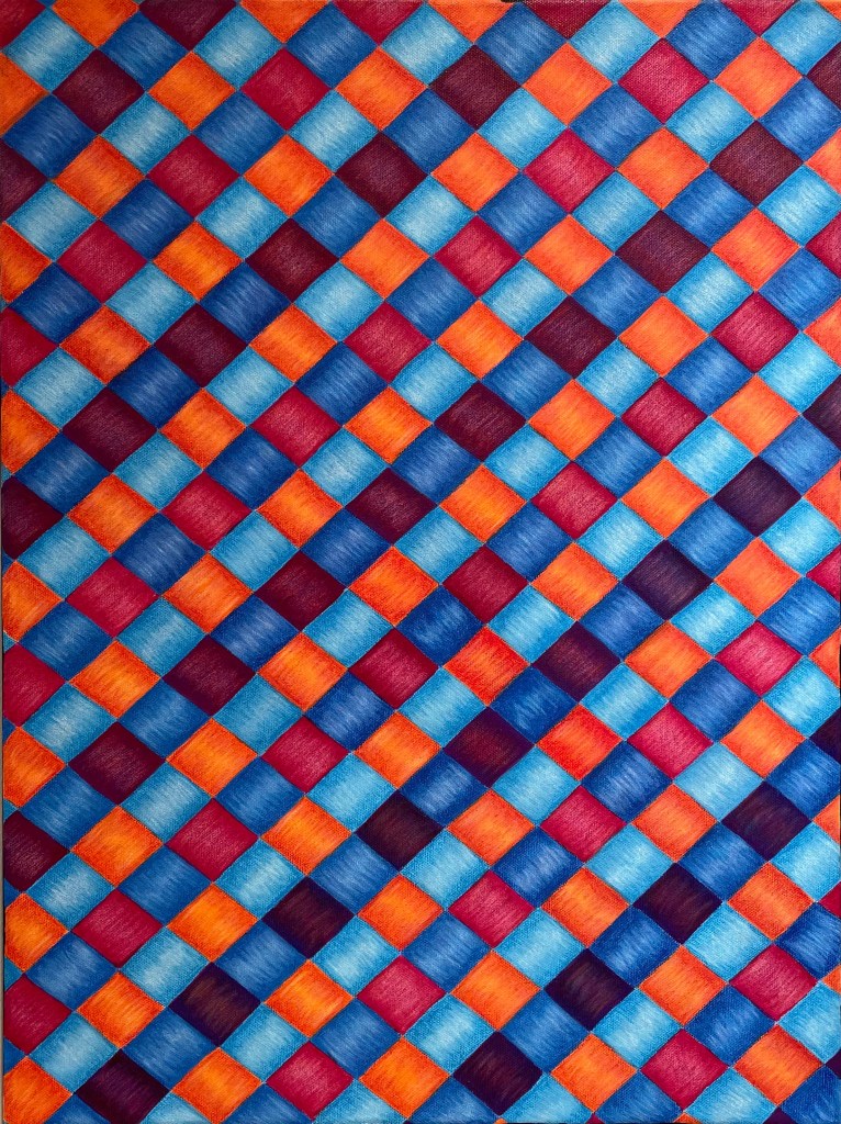 The painting is primarily in acrylic, with details in Prismacolor pencils that add depth to each woven piece of dried grass. The shapes and colors are in high contrast to create an illusion, drawing the viewer into the details of the weave itself.