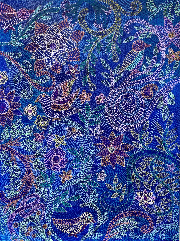 Historically, women across classes used this technique to recycle worn-out clothes into quilts or other valuable items, thereby weaving their own stories into the fabric. This piece, made with acrylic paint, tries to achieve that too. Each stitch is painted to mimic the running stitch and other motifs often used in nakshi kantha. I depict a garden at dusk, with flowers and birds decorating the canvas, and a hidden snake slithering through the plants.